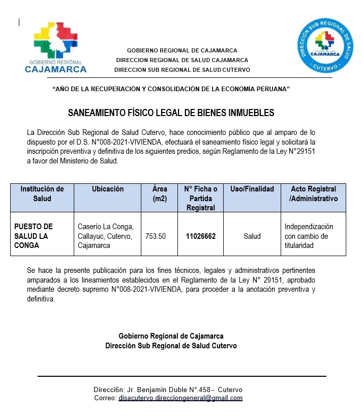 SANEAMIENTO FÍSICO LEGAL DE BIENES INMUEBLES PUESTO DE SALUD LA CONGA - Caserío La Conga, Callayuc, Cutervo, Cajamarca