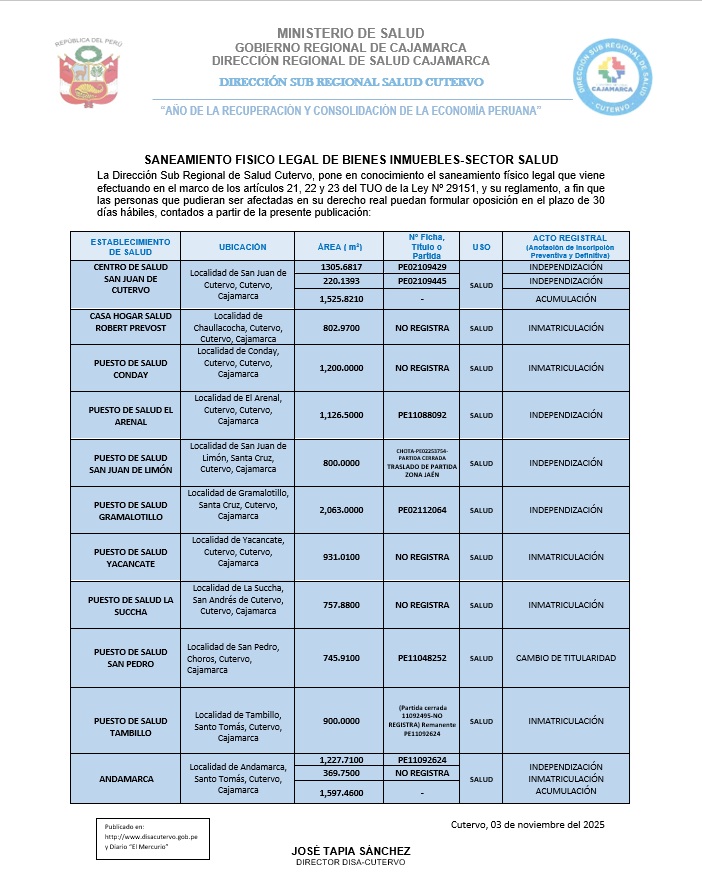La Direcci贸n Sub Regional de Salud Cutervo, pone en conocimiento el saneamiento f铆sico legal que viene efectuando en el marco de los art铆culos 21, 22 y 23 del TUO de la Ley N潞 29151, y su reglamento, a fin que las personas que pudieran ser afectadas en su derecho real puedan formular oposici贸n en el plazo de 30 d铆as h谩biles, contados a partir de la presente publicaci贸n.